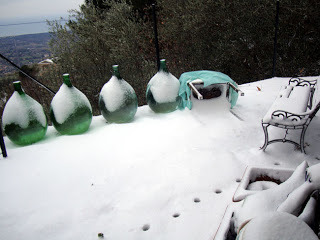Yesterday we had a blizzard - winds strong enough to blow a steel barbecue across the terrace and relocate the TV aerial, and a few inches of snow frothing over the olive trees like soapsuds. We're on the edge of a Siberian front that's bringing unusually cold weather across europe. It's still snowing on and off and more snow and freezing temperatures forecast for the weekend. Winter weather like this doesn't usually last for longer than a couple of weeks, though further north it's more severe.