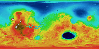 Many years ago I copied the 1970's Martian surface survey maps and assembled them and copied them into a single Mercator projection that I then proceeded to color for elevation. I was imagining a terraformed Mars, but the result was an interesting observation that not many people have repeated. I was reminded of it again this week while watching the Science Channel.