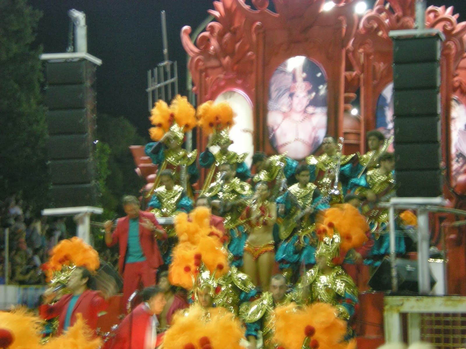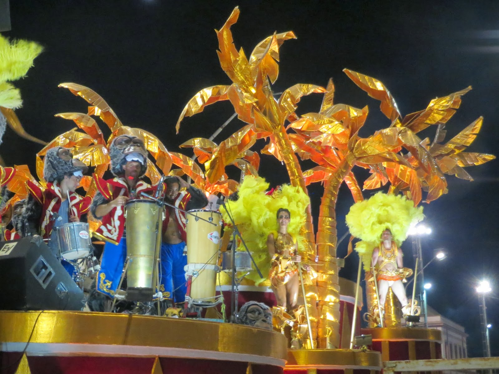 Each comparsa includes over 300 dancers, and is accompanied by 4 huge floats, a drum band (batucada) and a singing band. Each club chooses a theme and a theme song, and the theme is brought to life using the floats, costumes, decorations and songs and thousands of feathers. You can read more here.