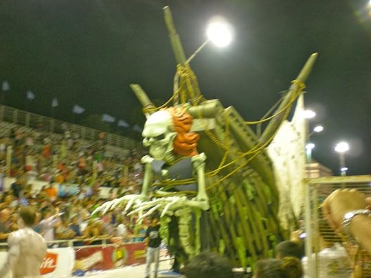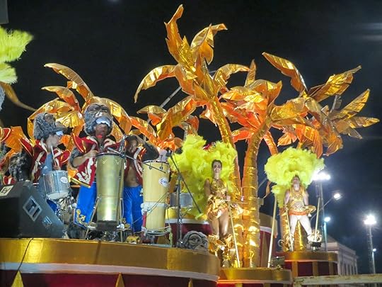 At first glance it may appear it's all about girls and fun, but it is way more than that. Each comparsa, or club, has a theme and chances are the dark side is included. In fact, it's tradition that the devil is always a participant. The three comparsas that compete in 2012 are O'Bahia -- "Toys," Kamarr -- "Q.E.P.D." or R.I.P., begins with a funeral dirge for Momo, the king of fun who has been buried with dancing skeletons and zombies. Let's inter all the evil in history and bring back the joy of Carnaval! And the Papelitos--"Latidos," the rape of the Americas by Europe and the killing of the land by mechanization and commercialization--kinda heavy stuff--but so entertaining with all those feathers and dancing jaguars and trees and a ghost ship.