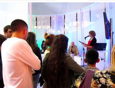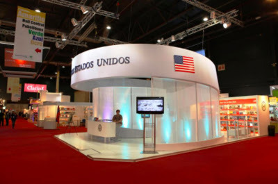 The U.S. Embassy stand is quite impressive with its sleek white curves and changing colors via spotlights. It is simple, elegant and clean at the same time. There are several iPads in the lobby area with games and puzzles having to do with the U.S. And then a circular room with white poofs for the presentations.