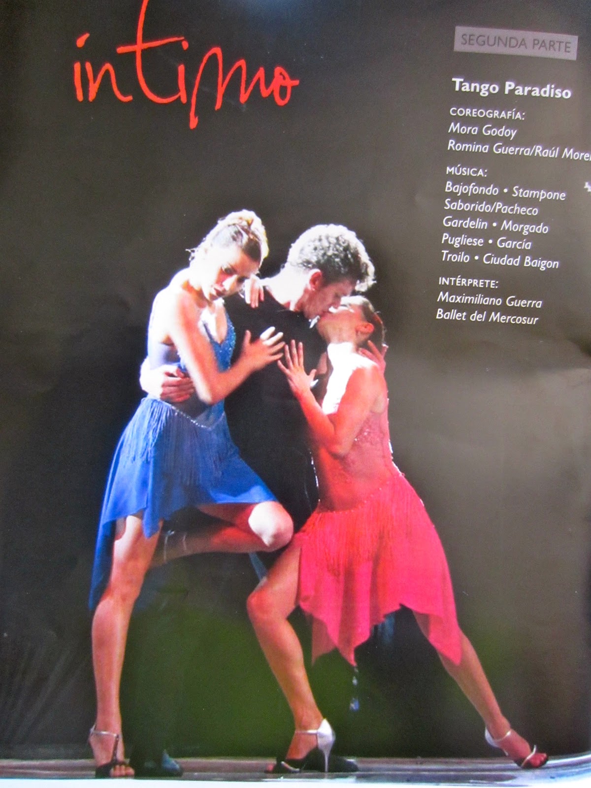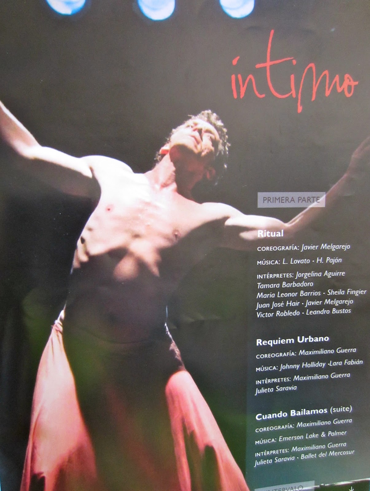 The show began with "Ritual," a ballet to folklore music like the Zamba and Chacarera and also African folklore by way of Cuba. Reminded me somewhat of the Rite of Spring. Then Maxi and his fantastic ballerina, Julieta Saravia, danced an impressive pas de deux, "Requiem Urbano" choreographed by him to French music of the 60s. The third piece, "Cuando Bailamos," also choreographed by Guerra, was set to Emerson Lake & Palmer, and had ballerinas on point dancing disco moves. I thoroughly enjoyed this first half of the show despite the over-reliance on the smoke machine, which made it difficult to see everything clearly despite our excellent seats. I can only imagine what the dancers felt breathing it in.