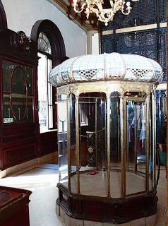 The French Fleur de Lys became the enigmatic emblem because at that time all of the expensive buildings in Buenos Aires were influenced by French architectural design, albeit La Belle Epoque of a few decades past. For that reason the premises seem much older than a scant century, and also because it is now derelict and decrepit. The gorgeous cage elevator hasn't worked in decades, and the iconic stained glass pastry quiosco glorieta empty but for the occasional tango shoe display.