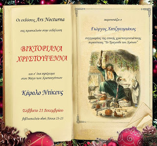 Οι εκδόσεις Ars Nocturna σας προσκαλούν το Σάββατο 21 Δεκεμβρίου και ώρα 6μ.μ. στο βιβλιοπωλείο της οδού Λέκκα 23-25 για το αφιέρωμα στον Μάγο των Χριστουγέννων, Κάρολο Ντίκενς στα πλαίσια της εκδήλωσης