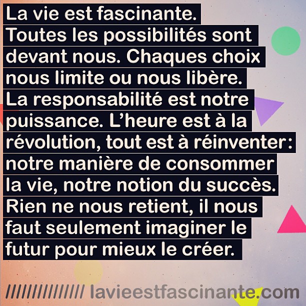 Le monde a besoin de vos projets, de vos solutions, de vos inventions, de vos intentions. #lavieestfascinante lavieestfascinante.com— M-Chantale Turgeon (@emcee) May 21, 2013