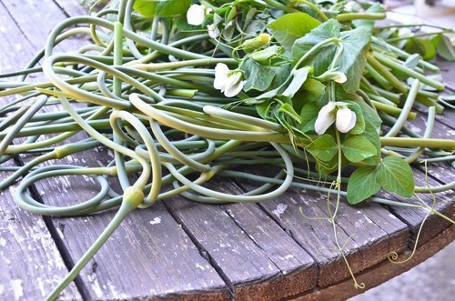 A garlic scape is the elongated, curly stem that emerges from the central stem of hardneck garlic plants in early summer. It’s actually the precursor of the garlic’s seed head or flower. The scapes are delicious, and removing them will ultimately result in a larger bulb of garlic. This is best done when the scape has about one full loop in it. If you wait too long, they will straighten out and become tough and stringy. Even if they straighten out, cut them off to encourage larger heads of garlic.