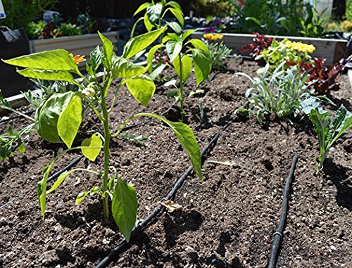 When choosing a drip tape brand, look for a product that has emitters spaces every 6-9 inches and is pressure compensating, which means it distributes water equally throughout the whole system regardless of row length (within limits) and elevation changes. The downside of drip tape is that it can only be used in a straight line, so it’s not great for containers or curvy beds.