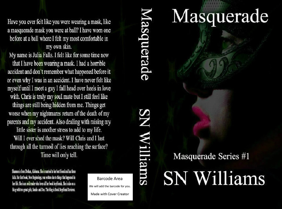 My name is Julia Falls. I felt like for some time now that I have been wearing a mask. I had a horrible accident and don’t remember what happened before it or even why I was in an accident. I have never felt like myself until I meet a guy I fall head over heels in love with. Chris is truly my soul mate but I still feel like things are still being hidden from me. Things get worse when my nightmares return of the death of my parents and my accident. Also dealing with raising my little sister is another stress to add to my life.Will I ever shed the mask? Will Chris and I last through all the turmoil of lies reaching the surface? Time will only tell.