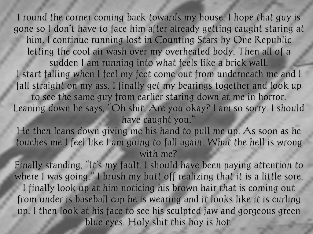 “Don’t do that. Don’t look away from me. You’re beautiful.” He grips my ass with his hands, squeezing and rubbing it as I stand above him. I breathe in the scent of his hair as he reaches down to my boots, and I hold onto his shoulders as he slips my feet out from each one. He puts them to the side and I open my skirt, letting it drop to the ground. He hooks his thumbs into the top of my panties, and his hands feel rough against my smooth skin. My breath quickens as he slips them down my legs while kissing and licking my waist. He turns me around and kisses the skin on my lower back and my heart thunders in my chest. I reach between my shoulder blades to unhook my bra, but Jason stands and replaces my hands with his. He opens the clasp and the fabric slides down my arms. He nibbles the skin on my shoulder and then kisses the place where he just sank his teeth in. He brings his mouth to mine as he opens the buttons of his own shirt. I reach my hands up to help him, and my fingers trace the black lines on his chest.