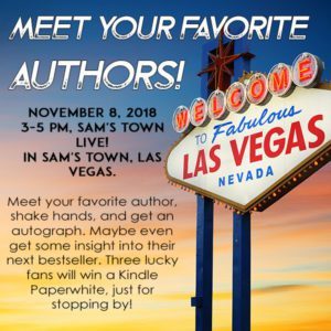 I’ll be at Sam’s Town, in the Sam’s Town Live! room on the main floor, in Las Vegas from 3-5pm on November 8th, and I hope to see you there! The address is: 5111 Boulder Hwy, Las Vegas, NV.