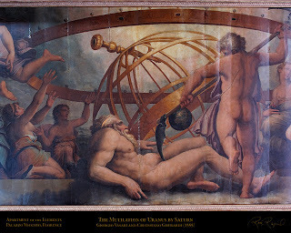 Perhaps the first act of horror inflicted in Greek mythology, an event that would make any male cringe, would be the castration of Ouranos by his son, Kronos. Gaea, infuriated that her husband, Ouranos, would imprison some of their children—the Cyclopes and the Hekatonkheires—in dark Tartaros because they were not as beautiful as the Titans, approaches her son Kronos and offers him a scythe of flint. Prophecy would dictate that the son would rise up and depose the father, and this was the occasion for Kronos to do just that. Vasari's painting does not depict the act graphically, but I am sure very few people don't know what castration is.