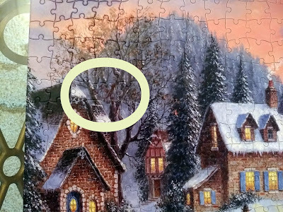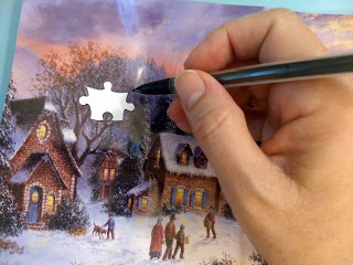 When I did this with my puzzle I discovered that the color of the photo didn’t quite match the color of the puzzle, and my replacement piece stuck out visually. My artistically gifted daughter suggested glazing over the new piece with some watercolor paints, so I tried that. It worked great. I even painted in a new tree trunk to line up with the surrounding pieces.