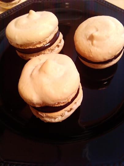 Fold in the almond flour and icing sugar mix using a spatula, and go slowly. Be careful not to overmix, or you’ll lose some of that nice fluffiness. When you’re done, it should look a cream colour, and be reasonably thick. Take this mixture and put it into a piping bag (pastry bag, to the Americans), and on cookie sheets covered with parchment paper, put 1-inch dollops of the batter. (Give them a bit of space, as they will spread a bit.)