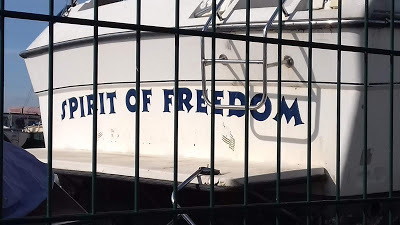 This in the boatyard of the marina. My cynical thought applicable to present times was: yeah, out of the water, up on blocks and behind a mesh fence