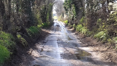 Rectory Lane. Because the fields are higher on either side and there are no ditches at this point it spends a great deal of time flooded. Knowing that many streams trace the route of footpaths I reckon this will become a stream if our civilisation collapses. Happy thoughts.