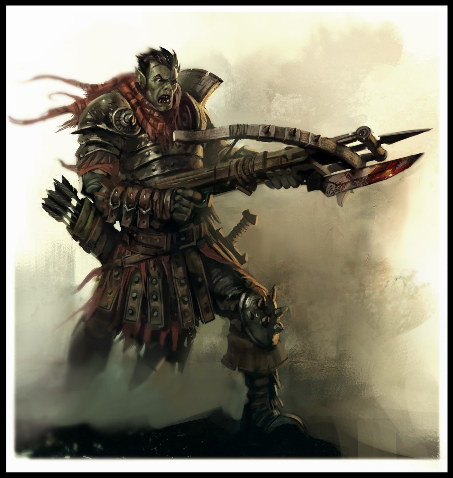 Readers here may remember how a number of years ago I was writing stuff for a Heavy Metal film. One story requested was an orcs and elves battle based on Rorke's Drift (Zulu). I needed superior weapons to keep the hordes of orcs at bay so I went with arbalests wielded by immensely strong half-breed orcs (the children of rape). I called the story Half Breed. Here’s Skander, the leader of that party of orcs.