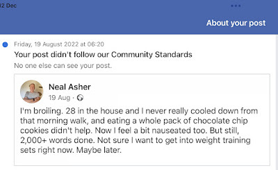 I recently had my Twitter account restricted, which came as a surprise what with a ‘free speech absolutist’ now in charge. But then Twitter is a big organization and despite the apparatchiks in ‘Trust and Safety’ being canned, it still has a lot of dead wood that needs cutting out – both human and algorithmic. I protested the restriction and it soon came off. I then screen captured my tweet and the one I replied to and put them up on Facebook for ridicule. And next I got a 24 hour ban from Facebook.