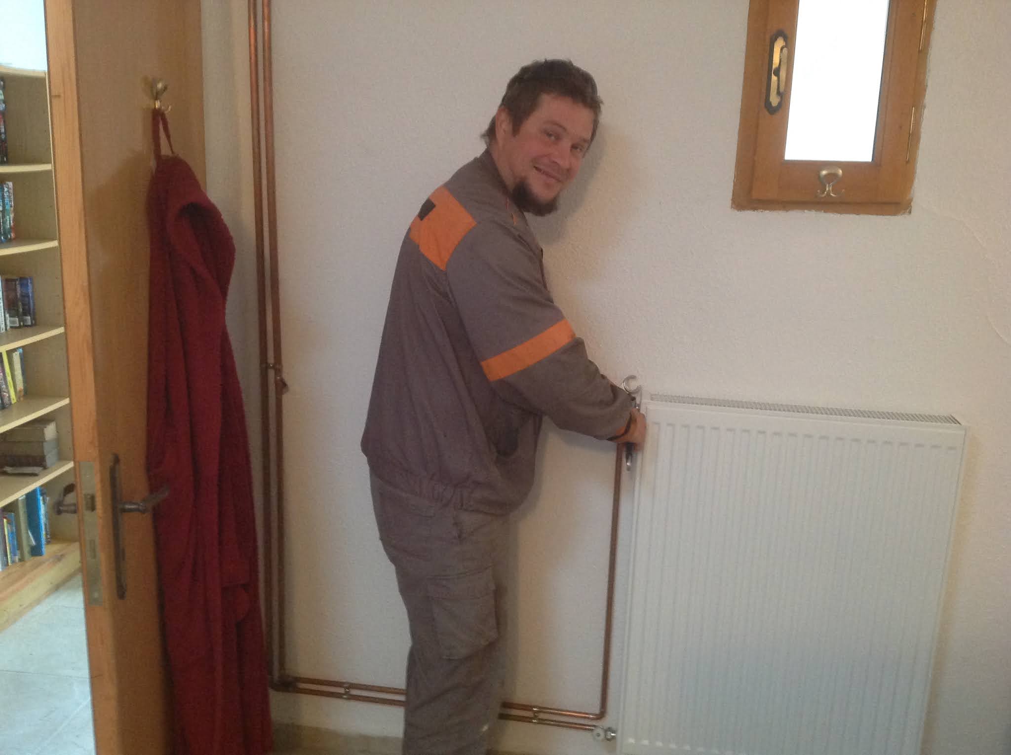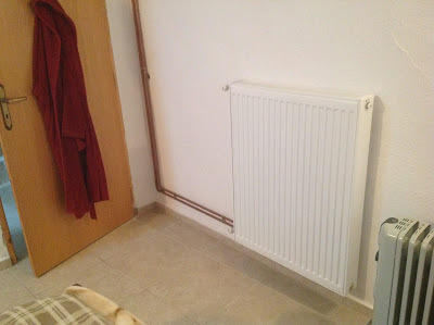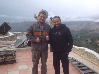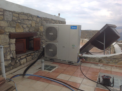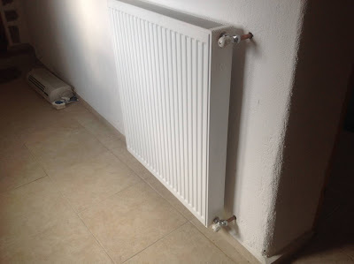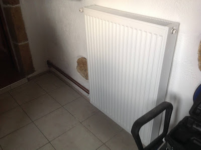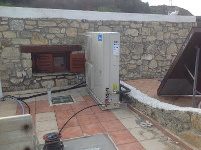 But, it is noticeable that throughout the house the temperature can vary by as much as five degrees and, as the stove goes out during the night, the cold comes back. This is to be expected in a stone house with concrete ceilings and tile floors, and no insulation. It’s not too bad – maybe down to 16 or 17C sometimes – but being a Southern softy with instant gas central heating in the UK, I really notice it, just as I notice the lack of carpeted floors. So, this winter I decided to get central heating installed. There is no piped gas here and if I bought either gas or oil central heating I wonder how the hell it would be delivered (can’t get a vehicle near my house). Anyway, Stelios at the Gabbiano restaurant suggested heat-pump heating. This basically extracts heat from the air in the same way that a fridge works and transfers it into the house radiators. I liked that idea, since sometimes it is possible to sunbathe on the roof but be shivering inside. So I went for it.