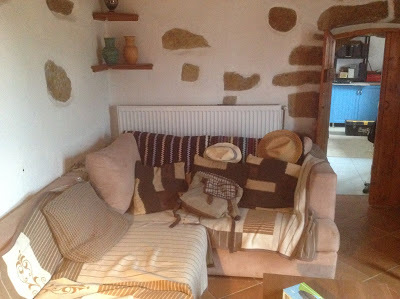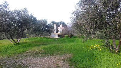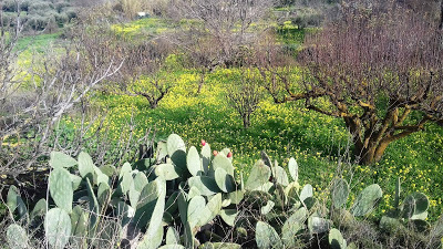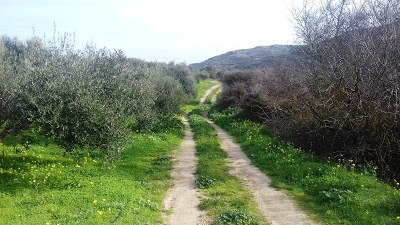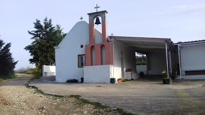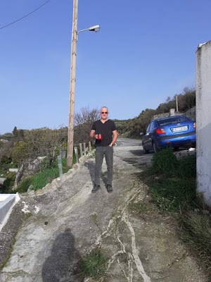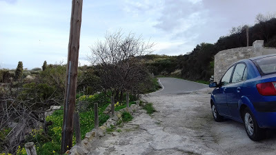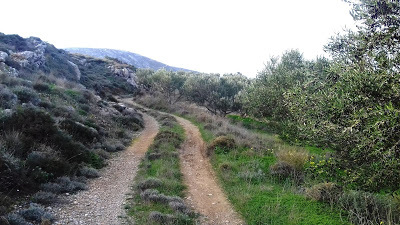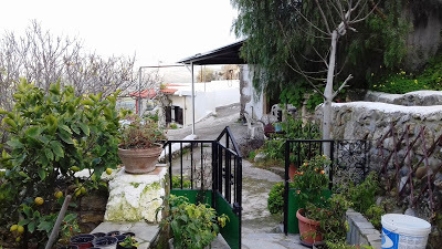 Setting out from my house. Left of the gate my lemon tree. Bare fig tree (lovely black figs) on the right, then after that an Agnus Castus. I grew it from a single peppercorn picked up in another village. It's other name is Monk's Pepper. The peppercorns it produces taste just like the real thing but, apparently they have a male softening effect hence, presumably, monks using them. Kazani (where they make the raki) on the right under that tin roof.