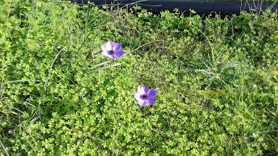 These are popping up all over the place. A little research tells me they areoing a little research I think they are poppy anemone 'coronaria'. They come bright red in the spring, lavender pink and white through the summer and, apparently, purple right now. There are masses of them up on top of the mountains I'll be taking pictures of tomorrow, if it isn't pissing down.