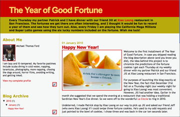 First off, happy New Year to everyone. I know it's January 2. Yesterday I was busy sleeping off the fun of New Year's Eve. Also, we went to see Nine. (Which you should totally see. The reviews are full of crap. It's wonderful.)But now I am back to work. And I'm very pleased to announce the launch of a new project. It's called The Year of Good Fortune. It's a blog. I know, who needs another blog? But this one is fun.
