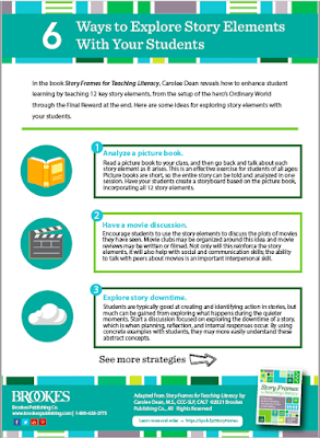 Brookes Publishing has created a lovely two-page handout entitled, 6 Ways to Explore Story Elements With Your Students. It's a great visual to share with teachers, librarians, and school administrators especially if you are requesting funds to purchase my new book - Story Frames for Teaching Literacy. The publisher and I have worked hard to keep this resource affordable by creating a robust downloads section with power points, activity sheets, and book synopses. It is due for publication in early April of 2021.