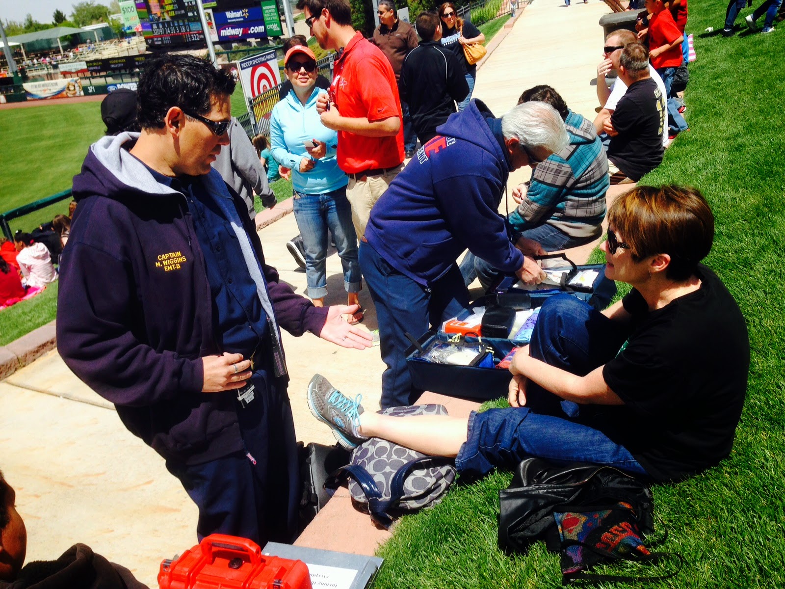 The EMT suggested maybe I should have been watching the game. I was at a dangerous sporting event after all. As he was saying this he had his back to the field, not exactly setting a good example. See photo above.