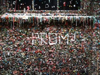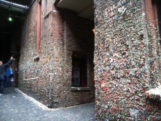 I imagined a Sandra Bullock romantic comedy where her high school sweetheart asks her to the prom in gum. They have a fight and go their separate ways, her to become an undercover FBI agent in a beauty pageant, and him to live his life as a fishmonger so he can stay near the Gum Wall and think about his lost love. Years later when her fiance, a Wall Street tycoon, wants to propose, he makes the mistake of writing his message in gum, making Sandra recall her tender romance with the fishmonger who is selling his fresh salmon right next door at Pike Place Market.