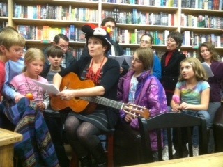 As promised, I sang Christmas Carol Spoofs based on young adult novels. Several local authors, as well as random people from the audience helped sing. There were also several wonderful kids who volunteered to play bells and other instruments. I'm the one in the jester's hat.