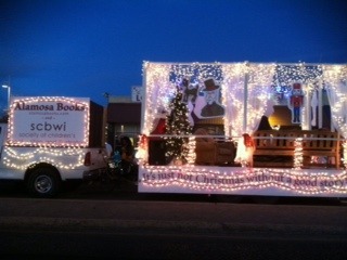 This was the float Alamosa Books created for Albuquerque's Twinkle Light Parade. See the Christmas tree in the left hand corner? Now check out the close up below...