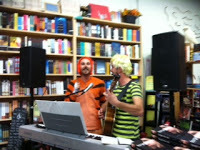 We watched the book trailer and then I read poems from the book. Music was provided by Kyle Ruggles dressed as Schroeder. His girlfriend came as Lucy. Kyle was the one who created the music for the book trailer. In this photo he was joined by Josh to sing the theme song from "The Addams Family." Josh is the talented young man who produced the book trailer. He's dressed as Calvin above. His girlfriend came as Hobbes.