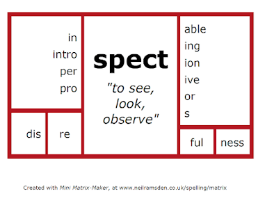 Teaching morphology using Structured Word Inquiry and word sums was a natural addition. The mini-matrix above uses the base element spect - "to see, look, observe." I created it using Neil Ramsden's Mini Matrix-Maker, found at https://www.neilramsden.co.uk/spelling/matrix/. It is fun to note that my decodable book Gods and Gifts, Three Greek Myths Retold is based on Greek Mythology, so exploring Latin and Greek influences was a fun addition.