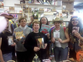 It's been a busy and exciting October. Earlier in the month I held a writing workshop at Page One Bookstore. Yesterday I spoke at the NMCTE conference for English teachers and today I met up with fellow SCBWI writers for a Halloween Booksigning at Bookworks. Bookworks is participating in our book drive for THE JOY OF READING, a collaboration between our local SCBWI chapter and several Albuquerque bookstores to collect books for children at risk. That's Connnie from bookworks on the far right holding up my book, COMFORT. I'm next to her dressed like a Texan and holding TAKE ME THERE. On my left is Kersten Hamilton with her brand new goblin book, TYGER, TYGER. I bought my copy today and can't wait to start reading it. My neighbor, friend, and critique buddy Lois Ruby is showing off SHANGAI SHADOWS and Chris Eboch, our regional SCBWI advisor, unfortunately has a thumb across her face, but at least you can see her book from the HAUNTED series. A random man in the bookstore was nice enought o try to figure out my cell phone camera.