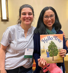 One of the best perks of being a member of SCBWI is getting to know so many talented children's authors and illustrators. It is a pure delight when I already love a book and then get to meet the author or illustrator behind that book at an SCBWI event. That happened a few years ago when I ran into Dow Phumirik at Second Star to the Right Bookstore. I already loved her masterfully illustrated Counting on Katherine: How: Katherine Johnson Saved Apollo Thirteen written by Helaine Becker. I was in the process of highlighting it as one of the titles I explored in my book, Story Frames for Teaching Literacy: Enhancing Student Learning Through the Power of Storytelling, so it was great fun to meet the illustrator. Since then I have become a big fan of anything illustrated by Dow, so I was thrilled to see another book of hers that I already loved at the Letters and Lines Conference Bookstore - Hello, Tree. Even more special, the author, Ana Crespo, was a conference presenter. She is an agent as well as an author and had wonderful insights to share during a pitch panel and a picture book critique seminar. In the photo below, Dow is pictured on the right and Ana is on the left.