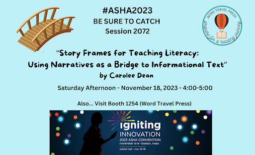 I will travel to Boston, MA, in one week for the American Speech-Language and Hearing 2023 Conference (#ASHA2023). If you are going, check out Booth 1254 for Word Travel Press along with my presentation on Saturday afternoon from 4-5 p.m. entitled "Story Frames for Teaching Literacy: Using Narratives as a Bridge to Informational Text." The presentation is largely based on Chapter 7 of my Story Frames book - "From Story Writing to Expository Writing: Bridging the Gap with Narrative Nonfiction," but the strategies I discuss may be used with any program.