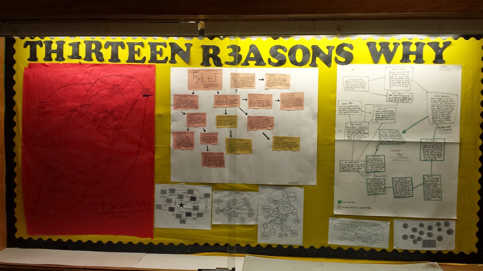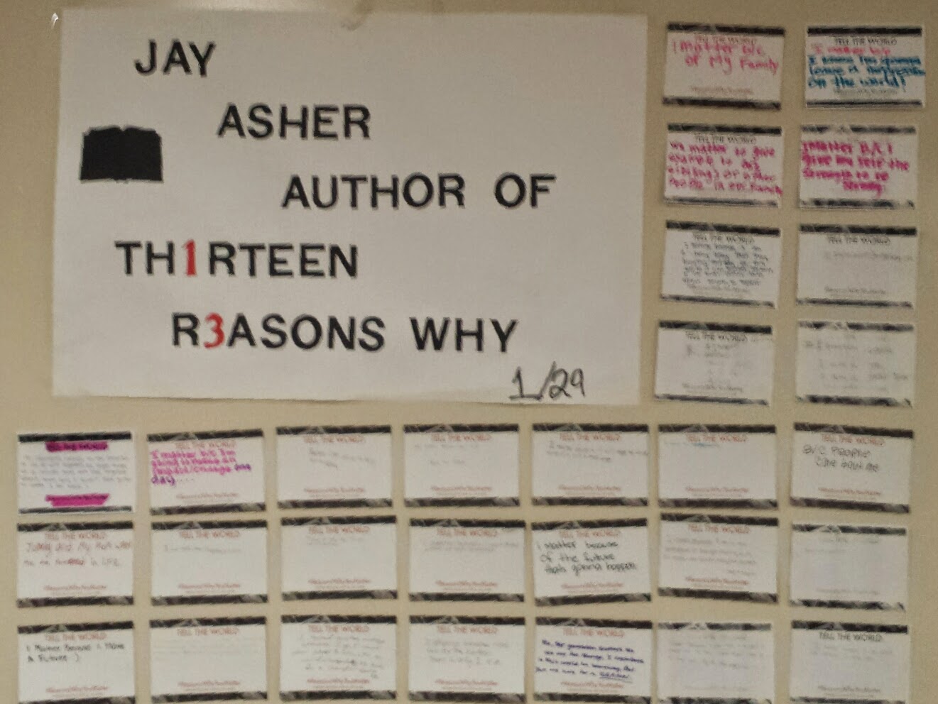Last year, I did a Skype visit with a class at East Troy that studies Thirteen Reasons Why. In the hallway, there were character charts students made for that class.