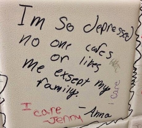 While I didn't make it into the women's restroom myself, I was told about a message scribbled on a tile in there and the responses written around it. While I don't condone writing on walls, I still had to send someone in there to take a pic.