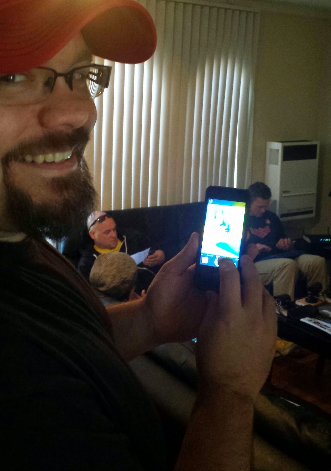 A few days ago, GSI and I rented a townhouse in Hollywood. In preparation for that night's adventure into the unknown, they made sure all of their equipment was operating correctly. Here, Shawn shows me the thermal imaging attachment for his phone. [Full names will be given in the group photo below.]