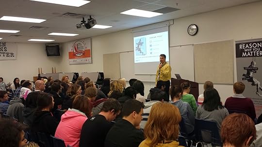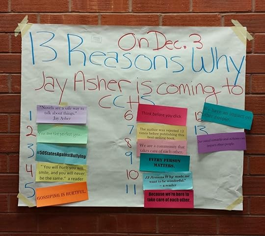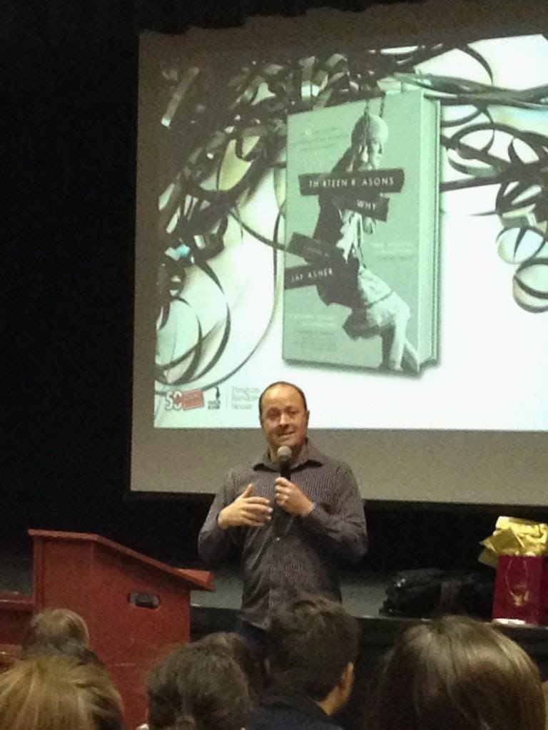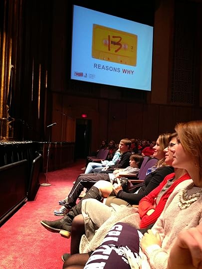 In my last post, I told you how inspired I am by students at the schools I visit. Now I need to tell you how inspired I am by so many faculty members and administrators at these schools. Even before this tour, on my regular author visits, some schools faced push-back from people who were uncomfortable bringing an author in to talk about the serious issues in Thirteen Reasons Why. But the schools recognized that this uncomfortableness and seriousness is exactly why we need to open or continue conversations in whatever ways work. So I have much respect for the people responsible for inviting me and making these visits happen.