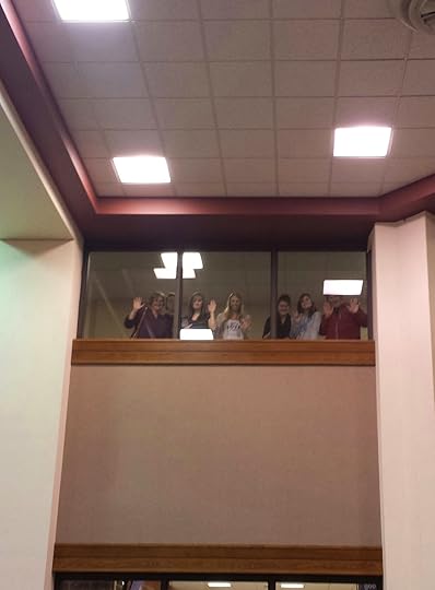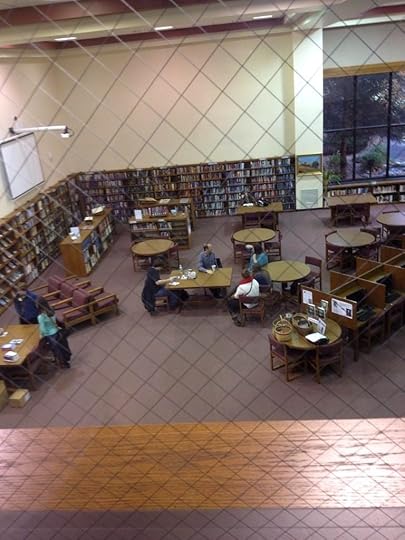 After speaking, I signed books in the library. Then I hung out in the library to chat as I waited to have lunch with thirteen essay-winning students. Any guesses as to how I got this photo of me sitting at a table?