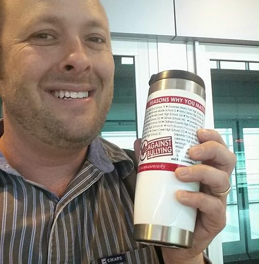 In a previous post about a previous school visit, I mentioned seeing the 50 States Against Bullying bookbag for the first time, and I made a comment that I'd love a 50 States Against Bullying coffee mug. So, with the names of the schools I'm visiting on this tour printed on it (and filled with caramel macchiato!)...