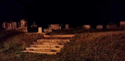 ...then we noticed a car shining three bright lights at us. Two were headlights, the other was a spotlight. The car doors were open and the sheriff's officers instructed Dennis to get out of the car. They wanted to know what we were doing there. Sadly, the church has had its unfair share of vandalism. But once they realized we weren't out there to do anything with vandalism, drugs, or whatever else two dudes drive way out there to do, they filled us in on some really eerie stuff that's happened there.