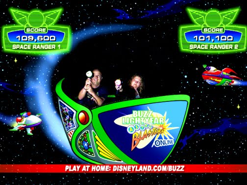 Here's our annual photo from the Buzz Lightyear ride. Unfortunately, the computer swapped our scores. JM beat me, as usual. You can tell by our faces who's the most competitive member of our family.