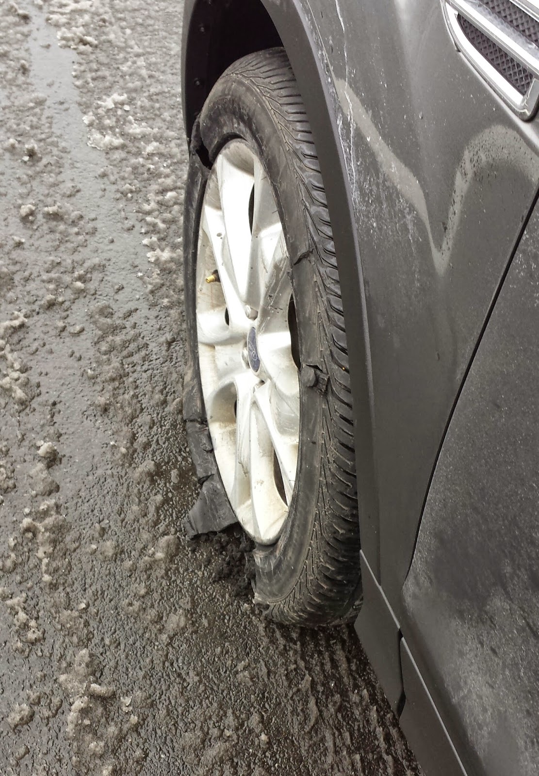 I didn't just pop a tire, I shredded it! So I sat on the side of the freeway (that's what we call them in California) as huge trucks zoomed by me on the slushy road. Eventually I got the spare tire put on the car...