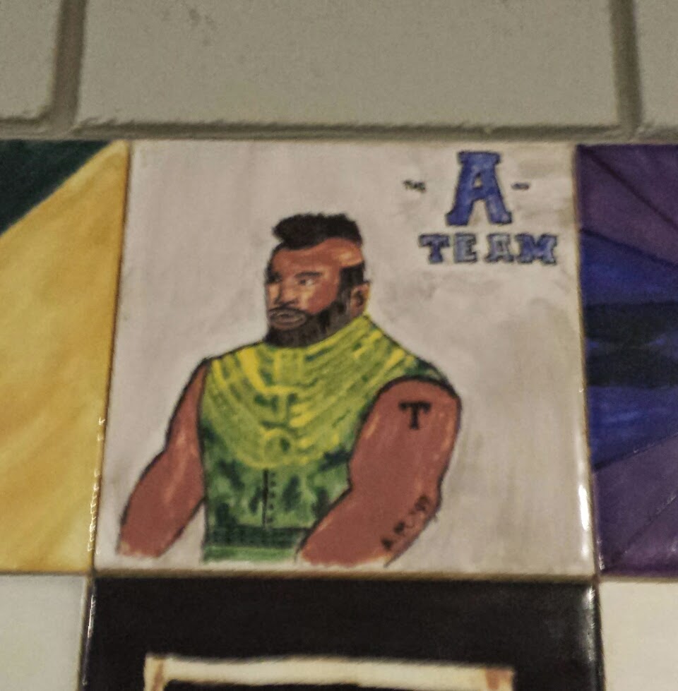 Given a brief tour of the school on my way to the cafeteria to grab coffee, I saw uniquely painted tiles along one hallway. Seniors decorate the tiles to share something about themselves. I don't know what Mr. T represented for this student, but as an A-Team fan, I had to take a pic.