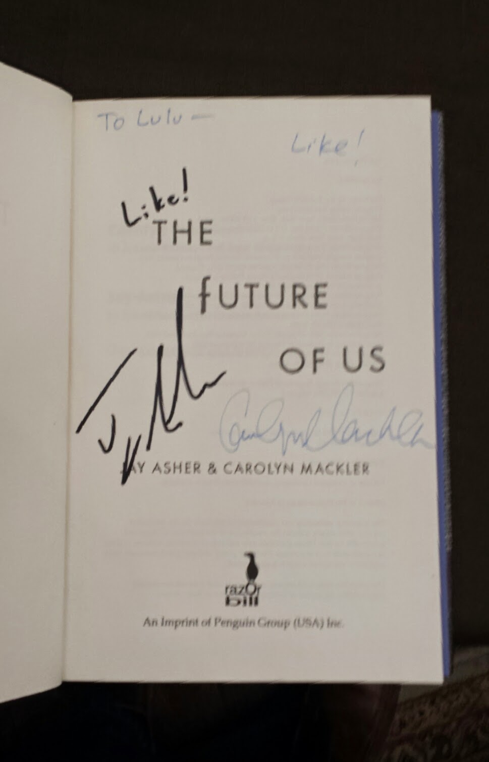 After the school visit, I headed to Words Bookstore, where I spoke to more students and adults, including an elderly woman who chose to read her first YA novel, and it was an honor to sign it to her. Another reader, who drove in from New York, finally had her copy of The Future of Us signed by me, it's other author!