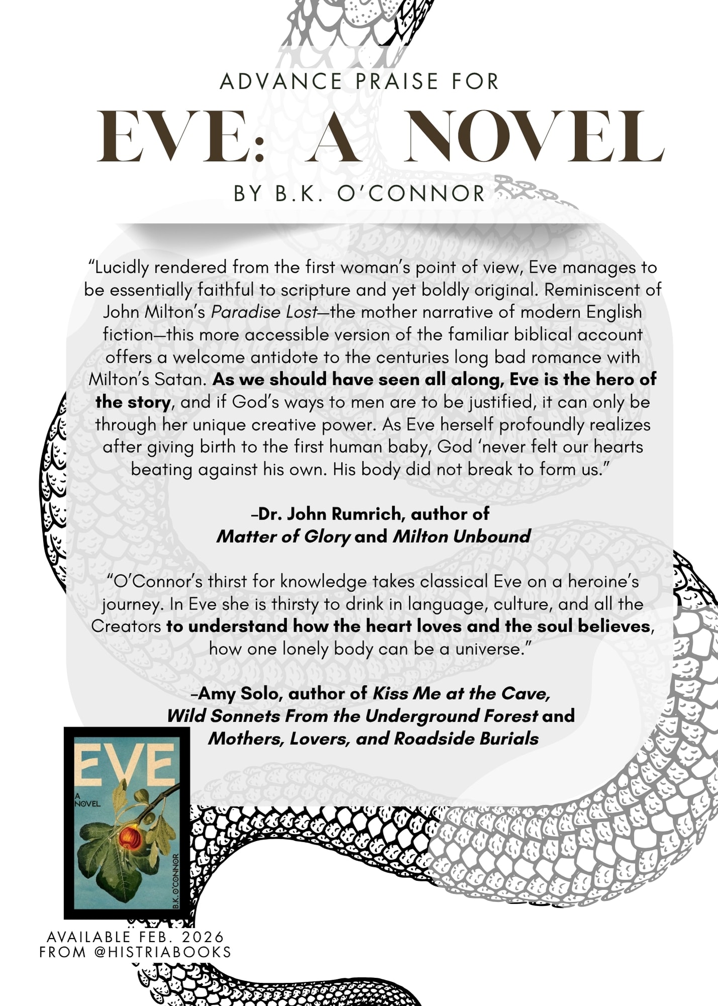 Eve by B.K. O’ConnorWith my own feminist, Paradise Lost retelling, I seek to justify Eve’s curiosity, to defend her exploration and the much-maligned pursuit of knowledge as the greatest good. Eve’s fall was our awakening, not our weakness. Adam was ready to live an eternity in ignorance, because the low hanging fruits were good enough. It was Eve who dared to reach higher. It was Eve who gave birth to human consciousness. Eve was wise: to take, to eat.