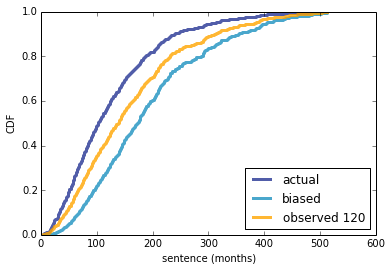 The observed distribution is almost as biased as what would be seen by an instantaneous observer. Even after 120 months (near the average sentence), the observed distribution is substantially biased: