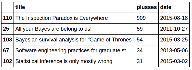 Two of the top 10 are articles written by students in my Bayesian statistics class: "Bayesian survival analysis for Game of Thrones" by Erin Pierce and Ben Kahle, and "Bayesian analysis of match rates on Tinder", by Ankur Das and Mason del Rosario. So congratulations, and thanks, to them!