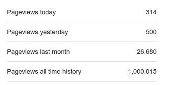 So it is a special pleasure for me to announce that, early Sunday morning (November 1, 2015), this blog reached one million page views. I am celebrating the occasion with a review of some of my favorite articles and, of course, some analysis of the page view statistics.